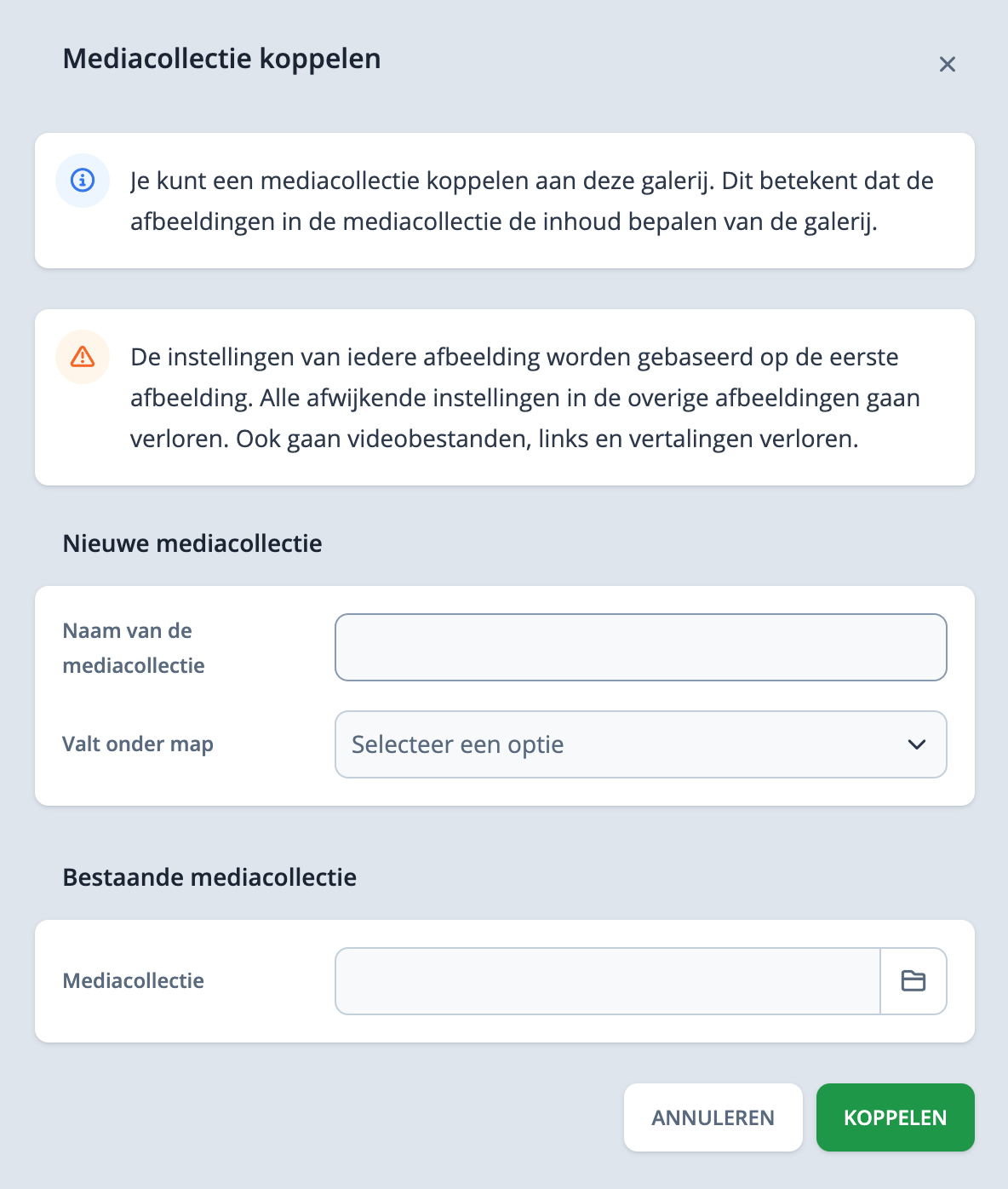 Er kan gekozen worden om een bestaande media collectie te koppelen of een nieuwe media collectie aan te maken. Er wordt in dat geval een nieuwe media collectie map aangemaakt in bestandsbeheer.