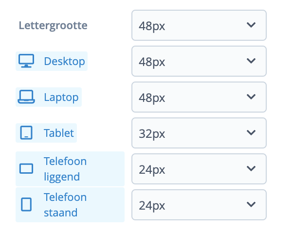 Ondanks dat de diverse blokken standaard responsive zijn in Waanders. Studio kun je de opmaak per device finetunen. Zo kun je een tekst zeer groot tonen op de desktop en op smartphone kiezen voor een kleinere tekst of zelfs een ander lettertype. Onderstaande video toont hoe je per device de opmaak kunt finetunen.