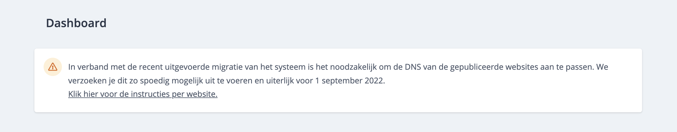 Door de migratie welke heeft plaats gevonden op 3 juni (00:00 uur) dient de DNS van gepubliceerde websites te worden aangepast. Op het dashboard van jouw Waanders. Studio account vind je instructies voor het aanpassen van de DNS per gepubliceerde website. Wanneer de DNS van een website is aangepast zal deze automatisch van het overzicht verdwijnen. Dit kan maximaal 24 uur duren in verband DNS caching.